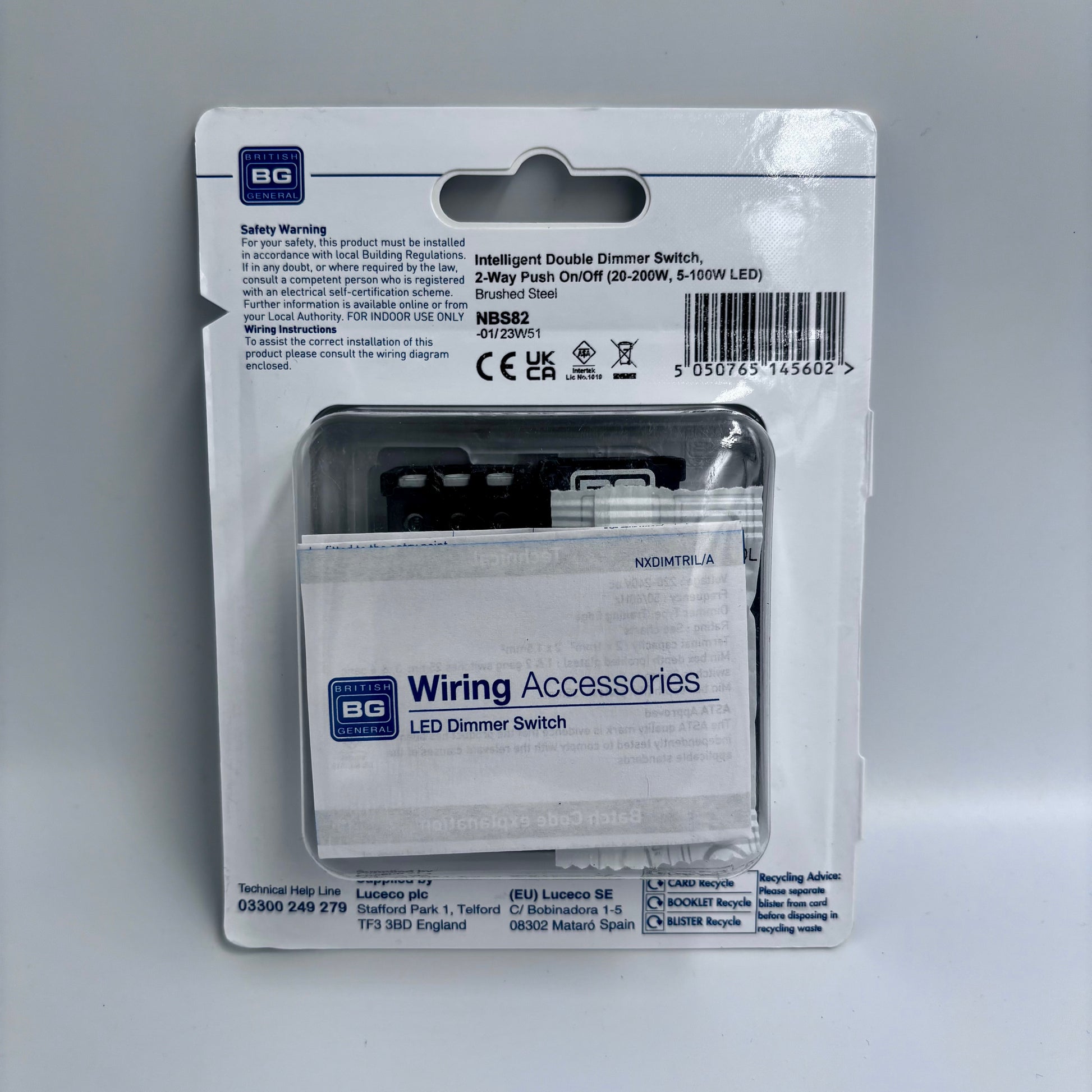 Enhance your home's lighting ambiance with the British General Nexus NBS82 LED Dimmer Switch. A perfect addition to any room, this 2-gang, 2-way switch offers precise control over your interior lighting, ensuring the right atmosphere for every occasion. Crafted from high-quality metal with a brushed steel finish, it is designed for durability and complements a modern aesthetic.