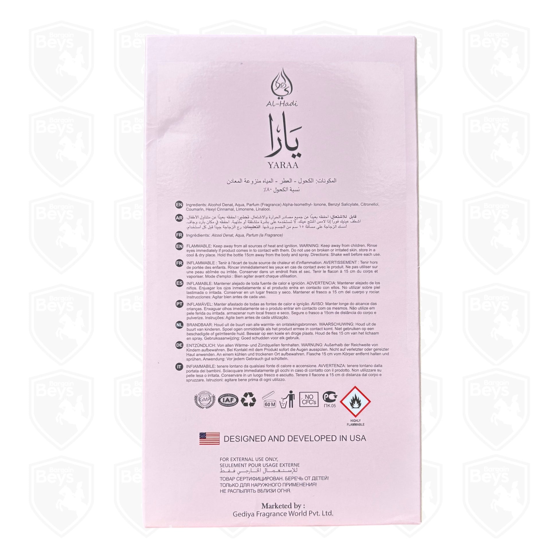 The Yaraa Pink Eau De Parfum Body Spray by Al-Hadi is a long-lasting fragrance in a 100ml bottle. This spray features a floral and fruity scent known as Yaraa Pink, perfect for everyday wear. With its easy application and long-lasting formula, this Eau De Parfum is a must-have for those who appreciate a classic and elegant fragrance.